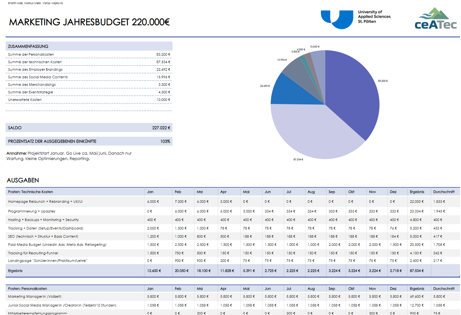 Parallel dazu wurde ein strukturierter Jahres-Marketing- und Budgetplan ausgearbeitet, der den Schwerpunkt ebenfalls auf Employer Branding und Recruiting legt. Der Finanzplan definiert konkrete Maßnahmen, Prioritäten und Budgetverteilungen zur nachhaltigen Stärkung der Arbeitgebermarke.